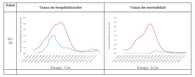 Para entender los gráficos, Fernández Niño destacó que primero hay que comprender que la línea roja continua representa el promedio móvil por cuatro semanas en no vacunados, por cien mil; la azul continua, el promedio móvil por cuatro semanas en personas completamente vacunadas por cien mil; la discontinua azul, tasa semanal en completamente vacunados y, finalmente, la discontinua roja, la tasa por cien mil en no vacunados.